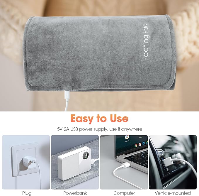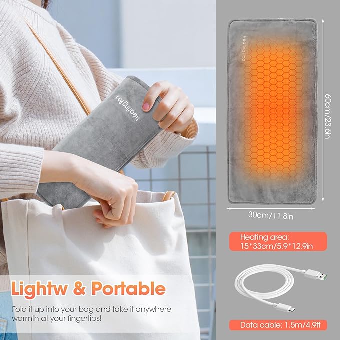 MANTA TERMICA USB 30X50CM. Perfecta para aliviar los dolores menstruales, de espalda, cuello, hombros, abdomen, piernas y cualquier dolor muscular, además de calambres, ya que a través del calor, promueve el flujo sanguíneo y relaja todas las partes del cuerpo. Accesorio ideal para el clima frío y un excelente regalo para cualquiera de sus amigos o familiares, cualquier edad, para sus dolores o simplemente, para acompañar este invierno. Con su termostato inteligente, es el accesorio perfecto para el clima frío. Hecho de material suave, la manta térmica eléctrica, está hecha de vellón de poliéster, lo que le brinda una experiencia cómoda, suave y agradable para la piel, lo que le garantiza un momento cómodo tanto en el sofá como en la cama. Con tecnología de calentamiento de grafeno, la manta de calor, se calienta rápidamente en segundos, brindándole el alivio rápido que necesita la persona. Con una interfaz tipo C, puede ser alimentada por un banco de energía, una computadora, etc. La manta térmica portátil es muy adecuada para viajar, ya que le brinda calor constante y disfruta de la terapia de compresas calientes. Tamaño: 30x50cm.