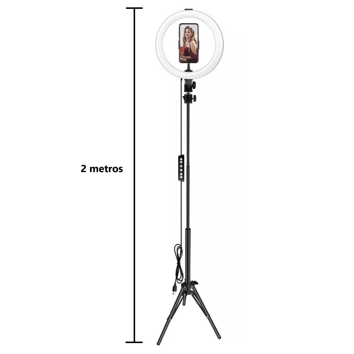 Aro de Luz LED, de diámetro 26cm, que incluye trípode, logrando una altura de 2m. Diseñado para creadores de contenido audiovisual y fotográfico. Perfecto para iluminar tu creatividad y elevar la calidad de tus fotos y videos. Este anillo te ofrece una iluminación versátil, como ajustable, que transformará tu espacio de trabajo en un estudio profesional. Adapta la iluminación a tu estilo con opciones RGB. Crea ambientes únicos para cada proyecto, desde tonos cálidos hasta colores vibrantes, con un simple botón. Para fotografías, obtendrás una iluminación uniforme, sin sombras para resaltar detalles. El soporte es universal, compatible con cualquier dispositivo de montaje. El anillo de luz se adapta a trípodes y soportes, para ofrecerte la mejor perspectiva. Incluye un control remoto para ajustar el color, brillo y modo de iluminación, sin tener que interrumpir tu sesión.