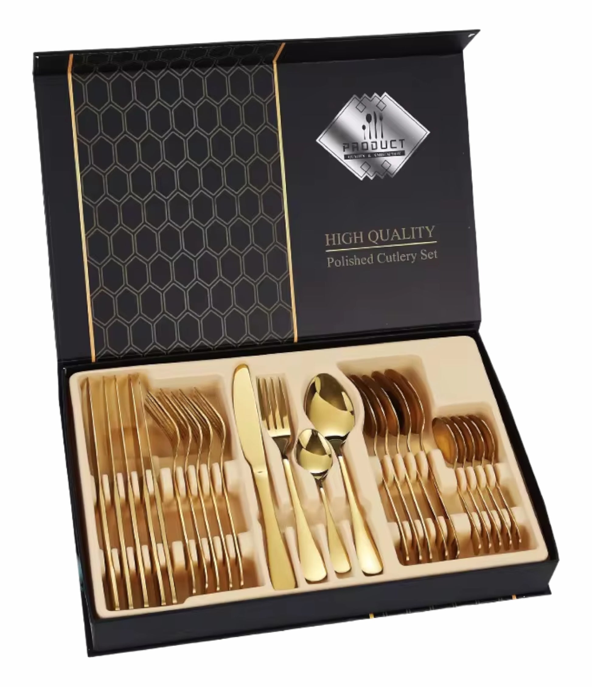 Juego de cubiertos dorados de 24 piezas. En tu mesa la mejor calidad, funcionalidad y durabilidad. Hermoso diseño vanguardista. Resistente acero inoxidable, contiene un alto porcentaje de cromo en su aleación, permitiendo que tenga una alta resistencia a la corrosión y al desgaste. Disfruta de tus mejores preparaciones y de ocasiones especiales con la línea de Cuchillería dorada. Todas las piezas vienen en un lindo estuche que, además, ofrece una excelente presentación para regalo. Contenido: 6 Cuchillos, 6 Tenedores, 6 Cucharas, 6 Cucharitas. Apto para lavavajillas.