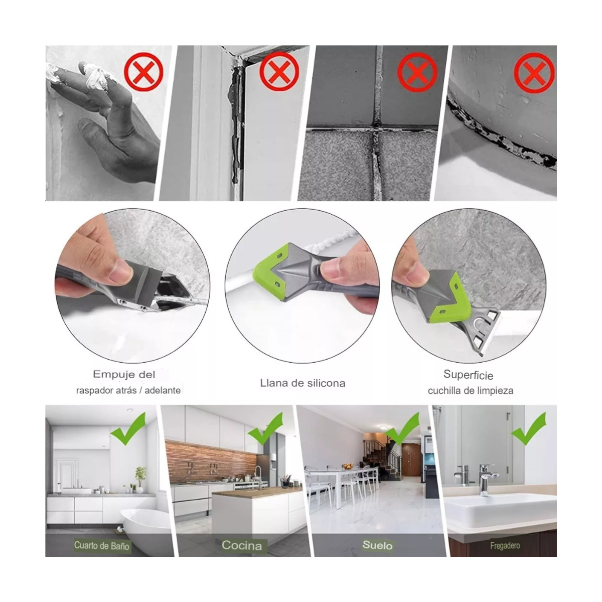 Simplifica tus proyectos de calafateo con el Raspador Removedor y Sellador de Silicona. Esta herramienta resistente y ligera, incluye cinco puntas de acero inoxidable en distintos tamaños para eliminar silicona, masilla seca o fragüe, con rapidez y precisión. Perfecto para usar en cocina, baño y ventanas, ayudándote a conseguir acabados profesionales sin esfuerzo. Con este kit completo, transformar tus tareas de sellado será más fácil que nunca. ¡Haz que cada proyecto luzca impecable! Renueva los sellos de tu ducha, lavamanos y lavaplatos, para evitar hongos y desagradables filtraciones, las que conllevan más problemas y gastos.